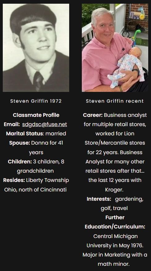 To submit your information on the website, please visit the contact page. If you don't have a profile block, one will be created for you. For an example, refer to Steve Griffin's Classmate Profile Block.